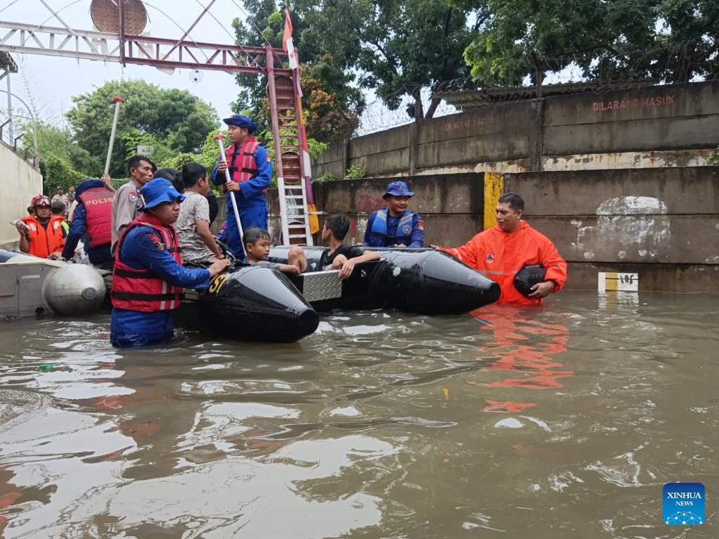 At least 34 roads in Jakarta were inundated by floods triggered by heavy downpours on Thursday, causing traffic disruptions and evacuation of residents in some areas of the city, according to the Jakarta Disaster Mitigation Agency. The agency also reported that the floodwater depths ranged from 15 centimeters to over 50 centimeters. (BPBD Jakarta/Handout via Xinhua)