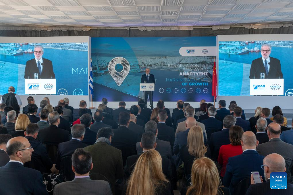 Greek Maritime Affairs and Insular Policy Minister Christos Stylianides speaks at the inauguration ceremony of a newly expanded car terminal (RoRo) in Piraeus, Greece, Feb. 6, 2024. Greece's Piraeus port inaugurated a newly expanded car terminal (RoRo) on Tuesday, aiming big in the trans-shipment business. (Xinhua/Marios Lolos)