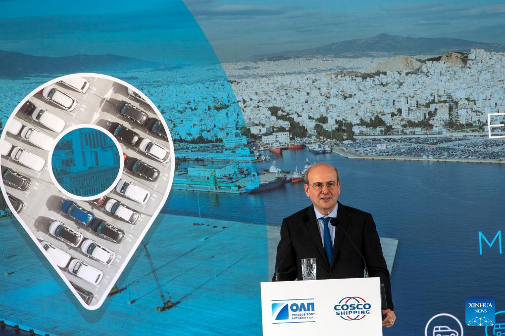 Greek Economy and Finance Minister Kostis Hatzidakis speaks at the inauguration ceremony of a newly expanded car terminal (RoRo) in Piraeus, Greece, Feb. 6, 2024. Greece's Piraeus port inaugurated a newly expanded car terminal (RoRo) on Tuesday, aiming big in the trans-shipment business. (Xinhua/Marios Lolos)
