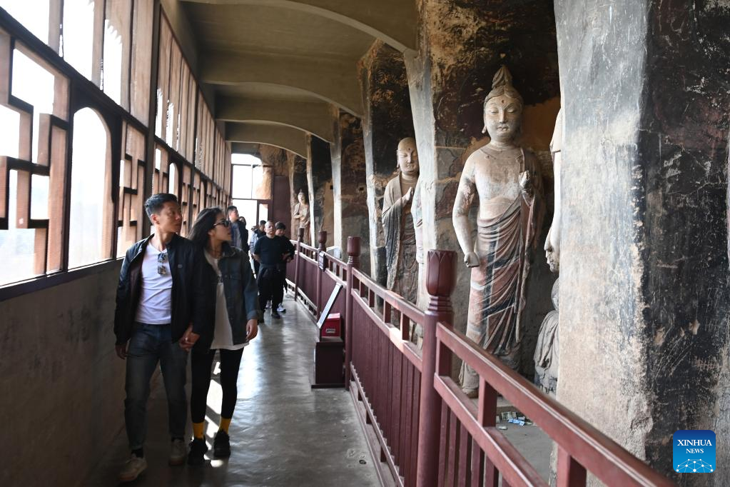 Tourists visit the Maiji Mountain Grottoes in Maiji District of Tianshui City, northwest China's Gansu Province, March 20, 2024. At dawn, the bustling snack streets of Tianshui, a city in northwest China's Gansu Province, were already teeming with activities, with visitors eager to taste the local specialty, malatang, literally meaning a numbingly spicy hotpot.