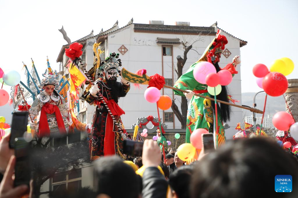 Shehuo performers stage a show for tourists at the ancient city of Tianshui in Qinzhou District of Tianshui City, northwest China's Gansu Province, March 20, 2024. Shehuo is a traditional carnival-like folk celebration, featuring folk performances that may vary from dragon dance, lion dance, to traditional Chinese opera, drum playing in different regions. At dawn, the bustling snack streets of Tianshui, a city in northwest China's Gansu Province, were already teeming with activities, with visitors eager to taste the local specialty, malatang, literally meaning a numbingly spicy hotpot.