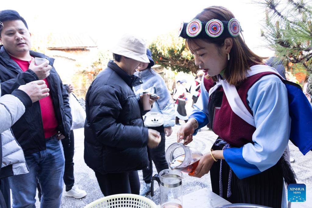 He Yuyue (R) serves tea for tourists at home in Yuhu village, Lijiang City, southwest China's Yunnan Province, March 27, 2024. Living in Yuhu village at the foot of the Yulong Snow Mountain, He Jielin has witnessed the changes in this ancient Naxi village.