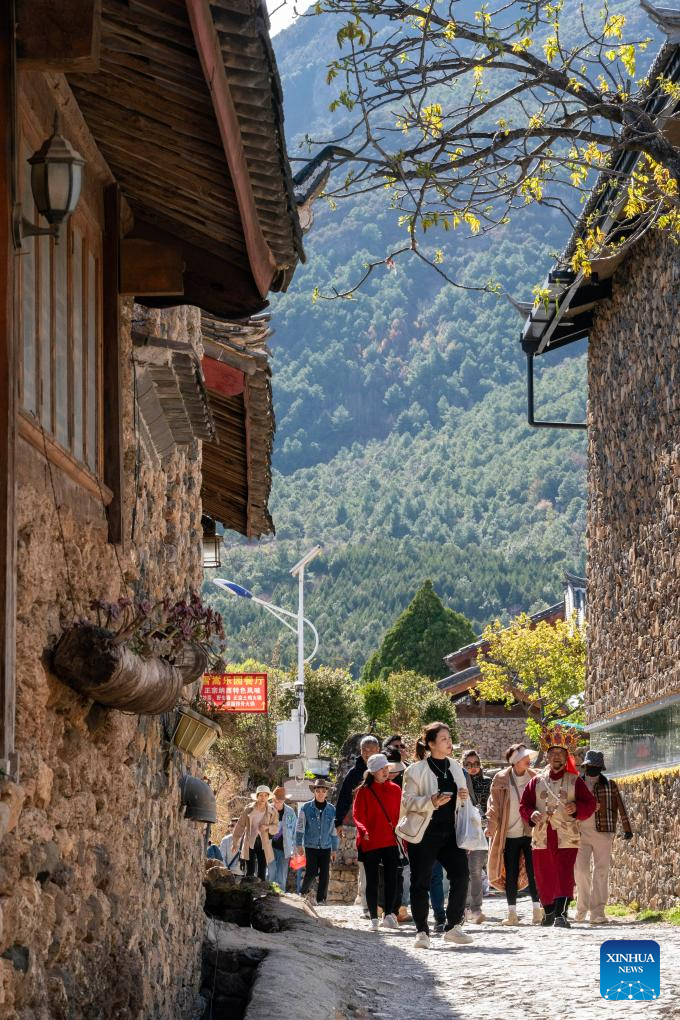 He Jielin (2nd R) guides tourists around Yuhu village, Lijiang City, southwest China's Yunnan Province, March 27, 2024. Living in Yuhu village at the foot of the Yulong Snow Mountain, He Jielin has witnessed the changes in this ancient Naxi village.