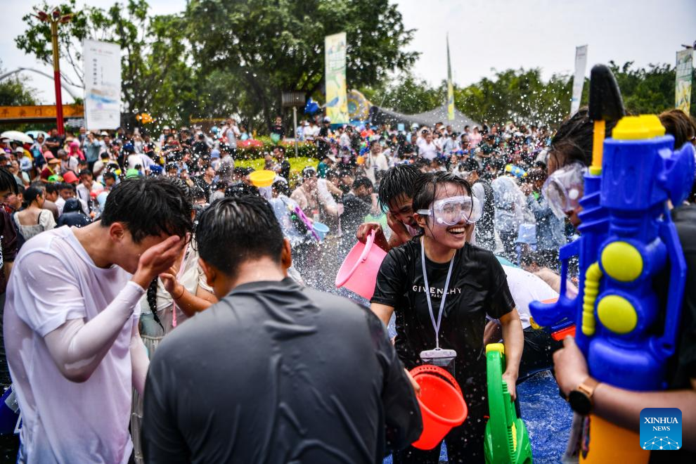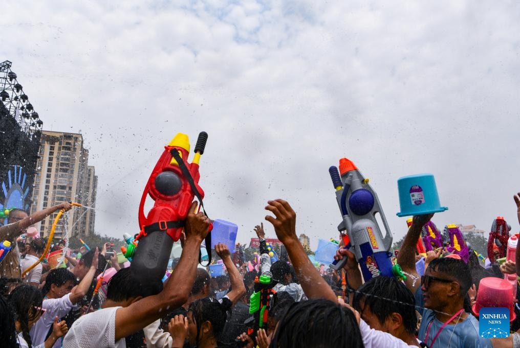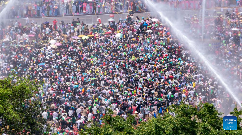 Tourists and local people celebrate the water-splashing festival at a square in Mangshi City, Dehong Dai and Jingpo Autonomous Prefecture, southwest China's Yunnan Province, April 12, 2024. The water-splashing festival is regarded as one of the most important festivals observed by the Dai and the De'ang people in Dehong Dai and Jingpo Autonomous Prefecture. People splash water on one another during the festival, wishing happiness and good fortune.