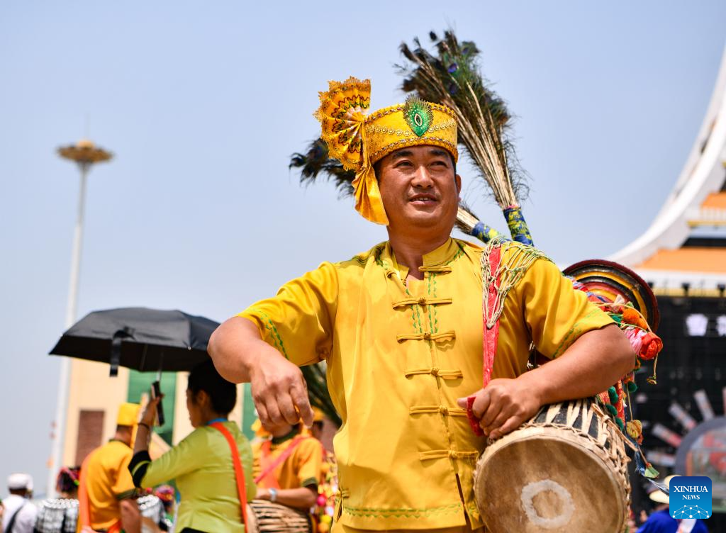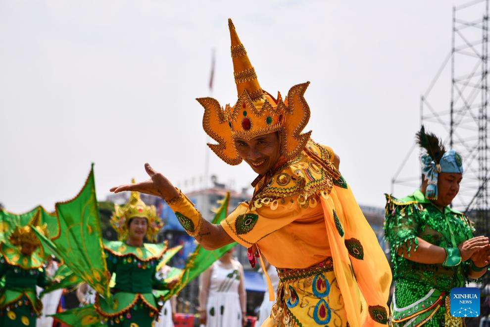 Performers perform during the opening ceremony of the water-splashing festival in Mangshi City, Dehong Dai and Jingpo Autonomous Prefecture, southwest China's Yunnan Province, April 12, 2024. The water-splashing festival is regarded as one of the most important festivals observed by the Dai and the De'ang people in Dehong Dai and Jingpo Autonomous Prefecture. People splash water on one another during the festival, wishing happiness and good fortune.