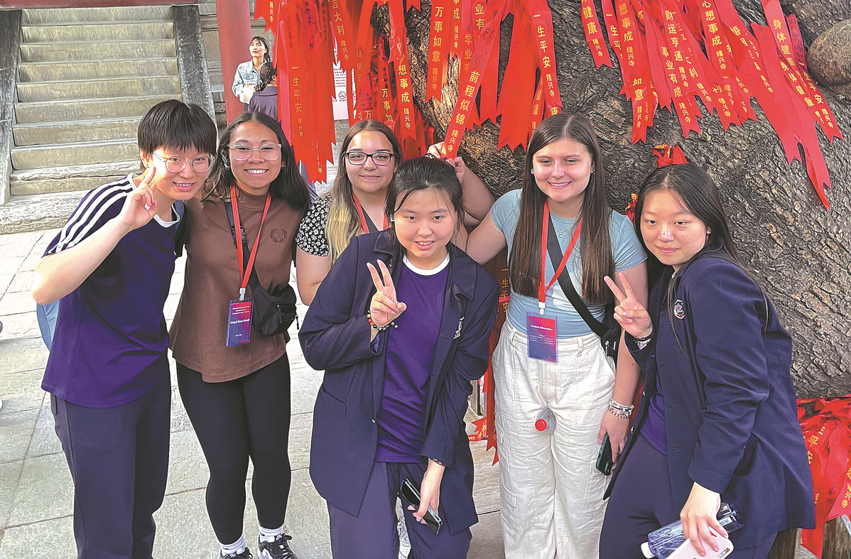 The red ribbons proved popular on Saturday among a United States delegation of students from Muscatine High School in the US state of Iowa and their Chinese peers from Shijiazhuang Foreign Language School in Hebei province.