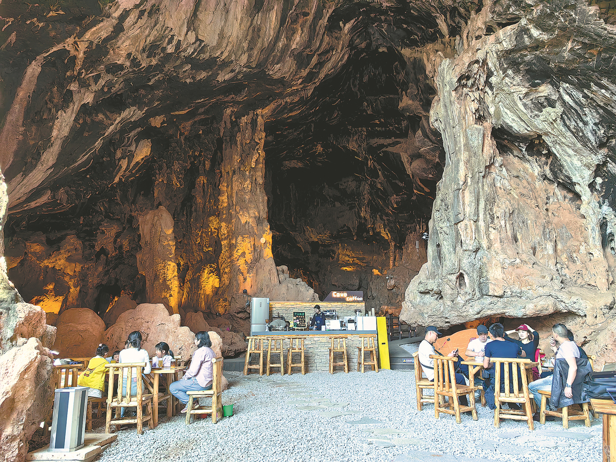 Visitors enjoy coffee at a cafe in the Gemstone Cave Scenic Area in Fumin county, Yunnan province, on March 16. JI ZHEPENG/XINHUA