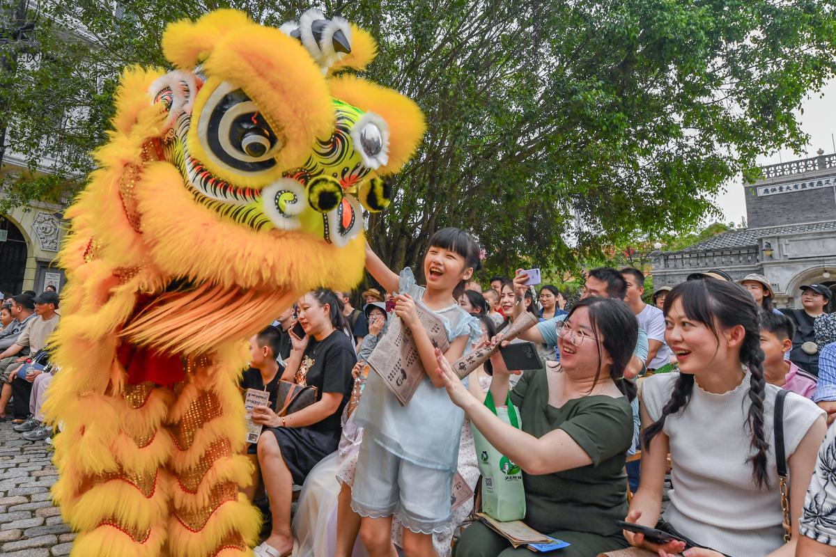 Visitors enjoy a lion dance performance in Haikou, Hainan province, on Saturday. Both Chinese cities and overseas destinations recorded a large number of Chinese tourists during the five-day May Day holiday. Sun Shijie / For China Daily