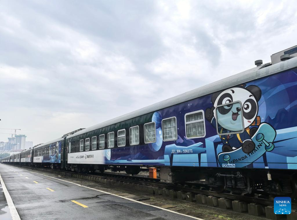 A "Panda Train" is seen in Guiyang, capital of southwest China's Guizhou Province, May 7, 2024. A tourist train, decorated with images, paintings and mascots of the panda and named as "Panda Train", linking Guiyang, Xishuangbanna and Laos, will depart from Guiyang on May 8. (Xinhua/Liu Xu)