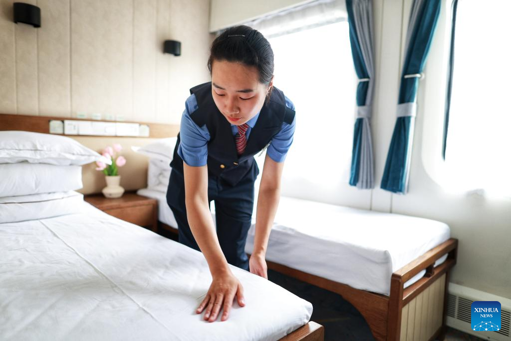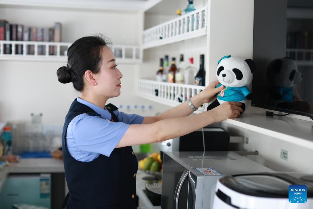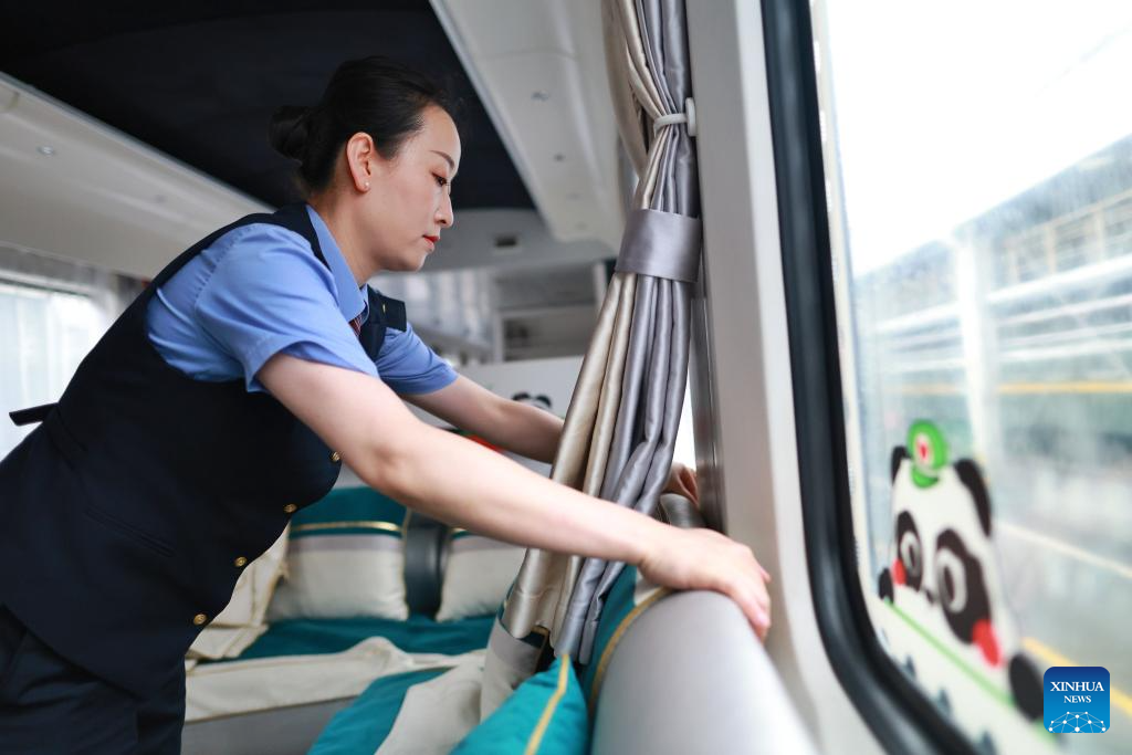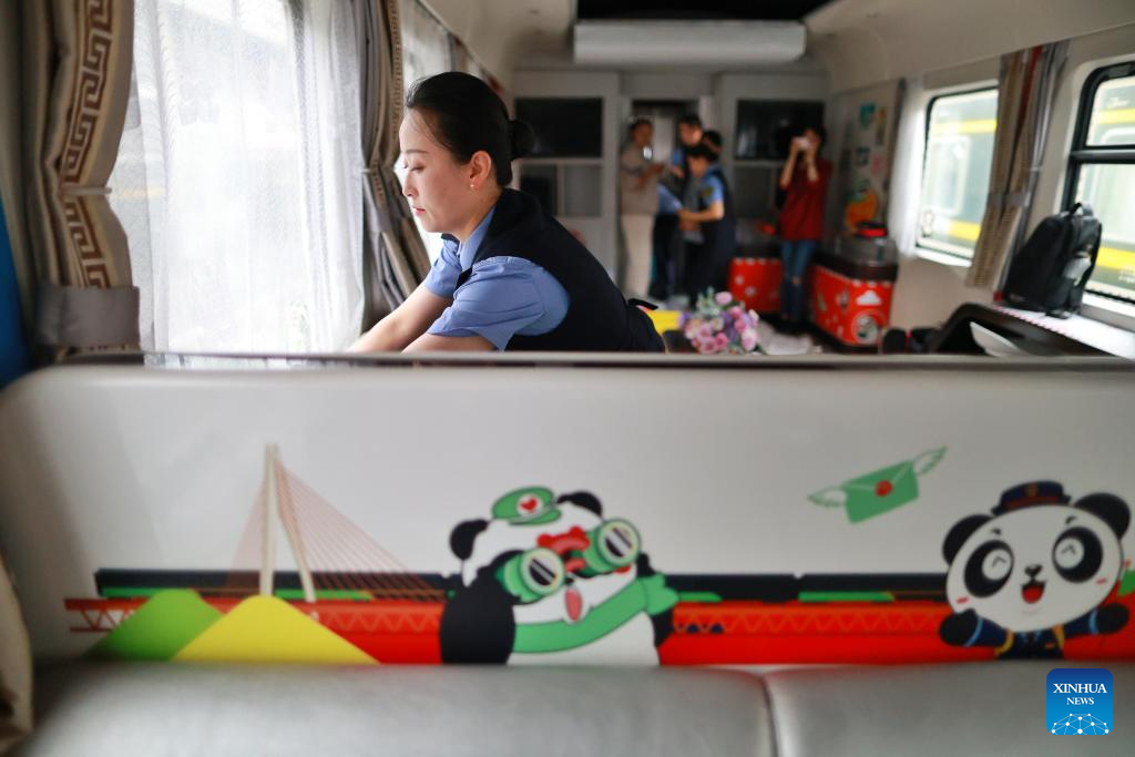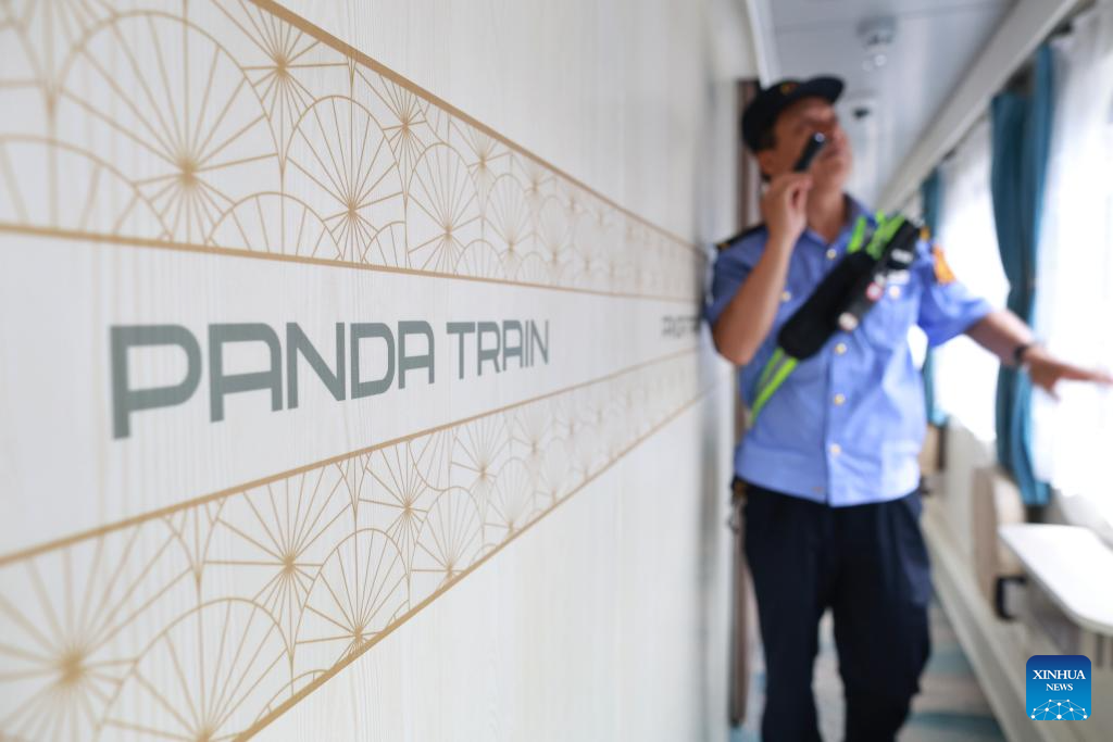 A train attendant prepares a "Panda Train" in Guiyang, capital of southwest China's Guizhou Province, May 7, 2024. A tourist train, decorated with images, paintings and mascots of the panda and named as "Panda Train", linking Guiyang, Xishuangbanna and Laos, will depart from Guiyang on May 8. (Xinhua/Liu Xu)