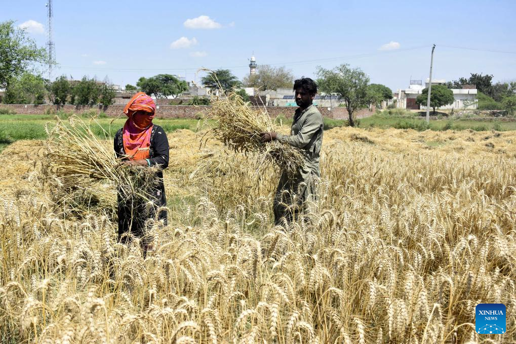 Farmers harvest wheat at a filed on the outskirts of Lahore, Pakistan, on May 8, 2024. (Photo by Sajjad/Xinhua)