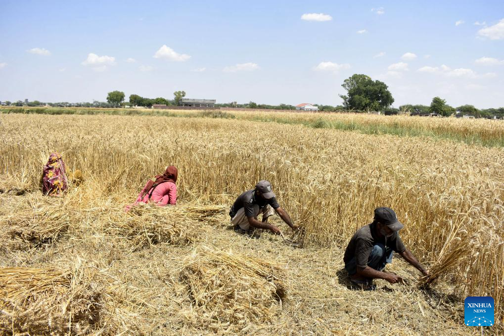 A farmer harvests wheat at a filed on the outskirts of Lahore, Pakistan, on May 8, 2024. (Photo by Sajjad/Xinhua)