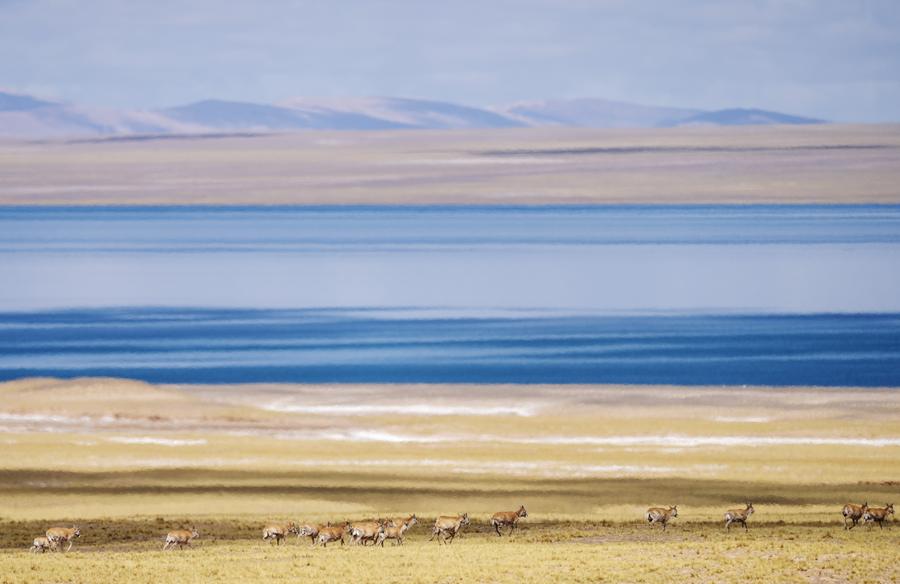 Female Tibetan antelopes are on migration to their birth-giving ground in Qiangtang National Nature Reserve in southwest China's Xizang Autonomous Region, June 13, 2024. (Xinhua/Fei Maohua)