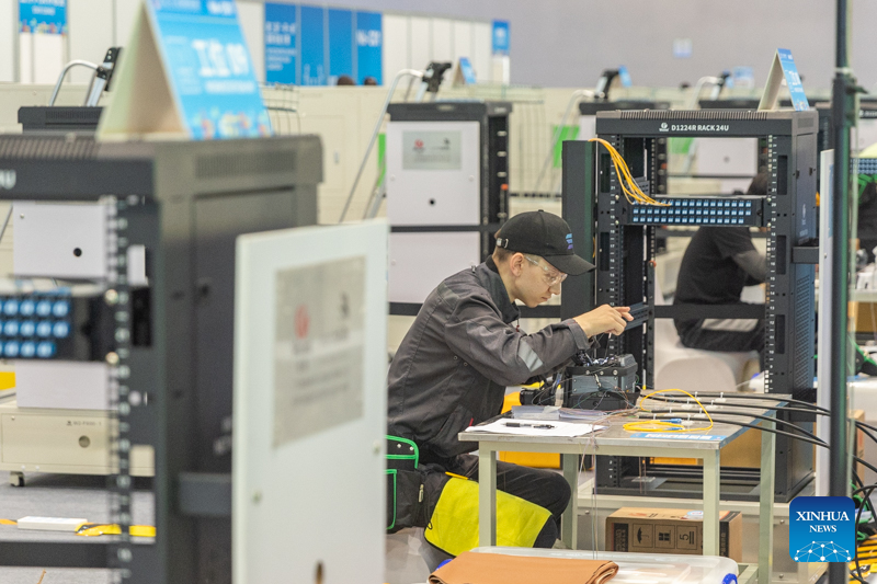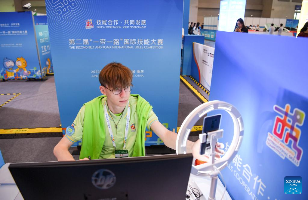 A contestant is pictured during a contest of the second Belt and Road International Skills Competition in southwest China's Chongqing Municipality on June 24, 2024. The second Belt and Road International Skills Competition kicked off at Chongqing International Expo Center here on Monday, attracting participants from 61 countries and regions. (Xinhua/Wang Quanchao)