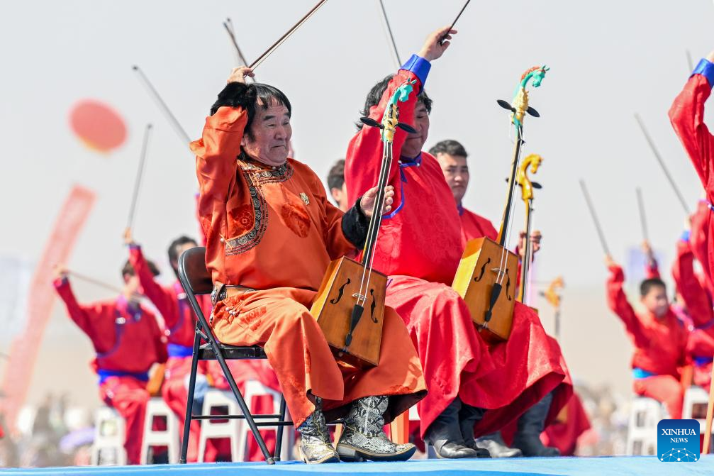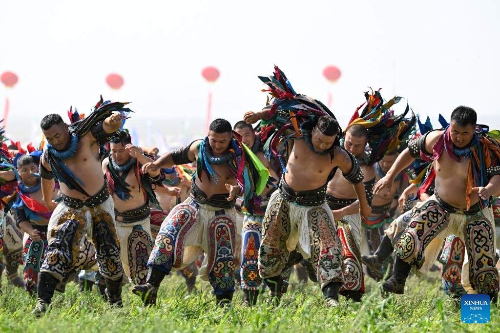 Artists perform during the opening ceremony of the 34th Naadam festival in Xilin Gol League, north China's Inner Mongolia Autonomous Region, July 14, 2024.