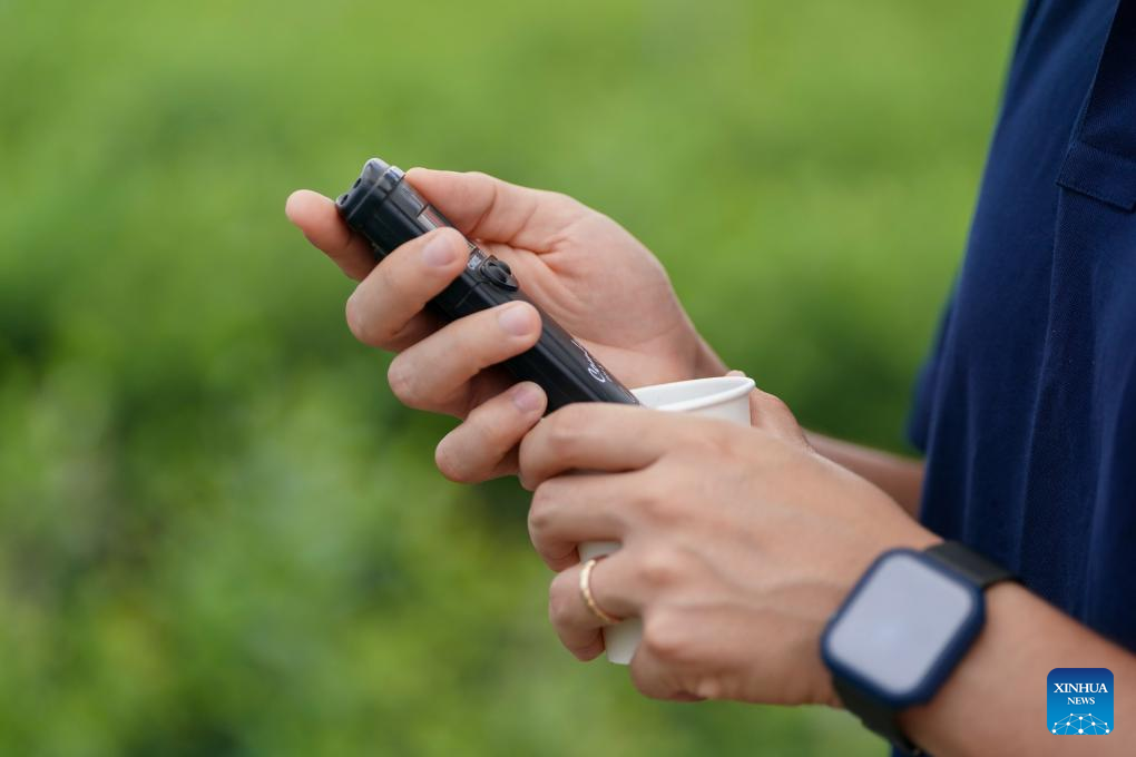 Marcelo Vergaray uses a pH meter to test the pH value of the nutrient solution for blueberries at a blueberry greenhouse in Mengzi, southwest China's Yunnan Province, July 9, 2024. Marcelo Vergaray is a 31-year-old fourth-generation Chinese-Peruvian immigrant from Peru.