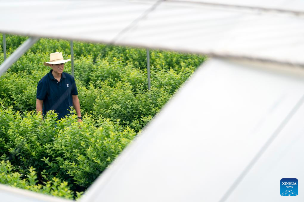 Marcelo Vergaray checks the growth of blueberry plants at a blueberry greenhouse in Mengzi, southwest China's Yunnan Province, July 9, 2024. (Xinhua/Chen Xinbo)