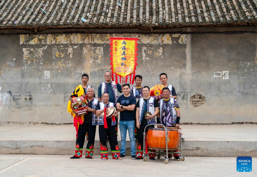 Marcelo Vergaray (4th L) makes cymbal accompaniment for a local lion dance team in Shilipu Village of Mengzi, southwest China's Yunnan Province, July 10, 2024. (Xinhua/Chen Xinbo)