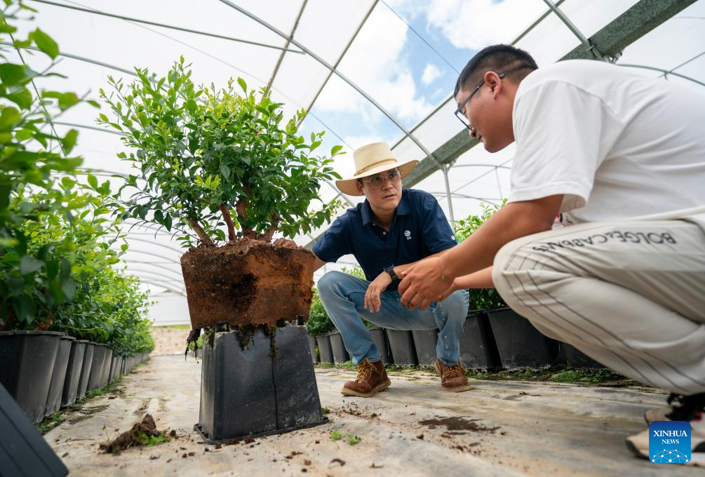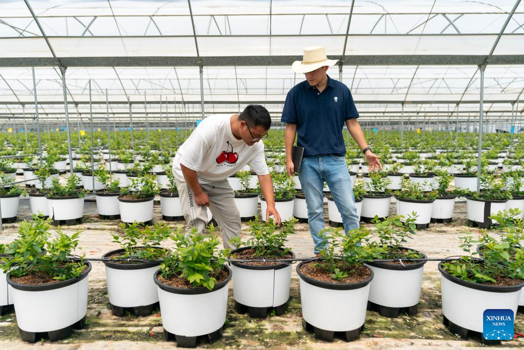 Marcelo Vergaray (2nd R) instructs Song Junhong, the director of a blueberry plantation base, on the care of blueberry seedlings, at a blueberry greenhouse in Mengzi, southwest China's Yunnan Province, July 9, 2024. (Xinhua/Chen Xinbo)