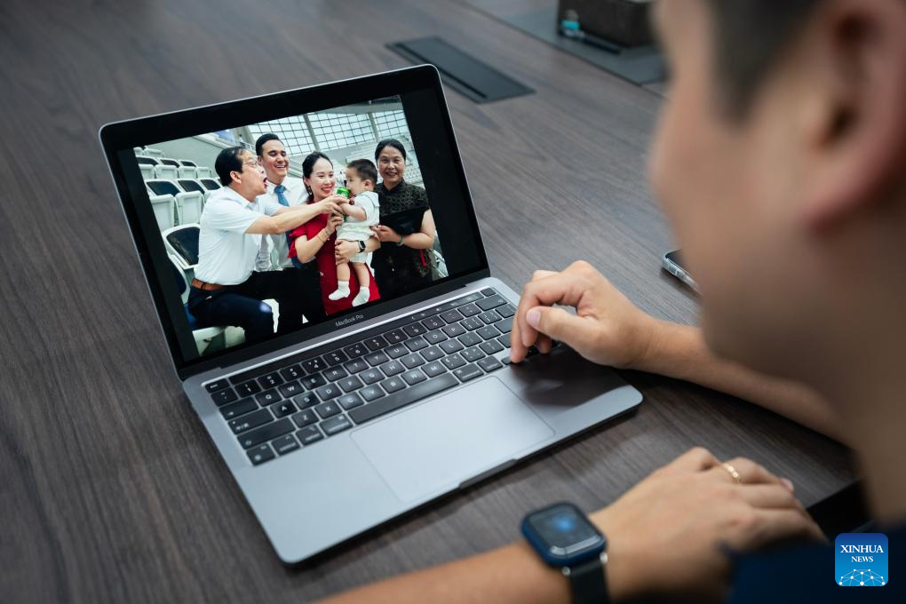 Marcelo Vergaray browses through family photos after work in Mengzi, southwest China's Yunnan Province, July 9, 2024. (Xinhua/Chen Xinbo)