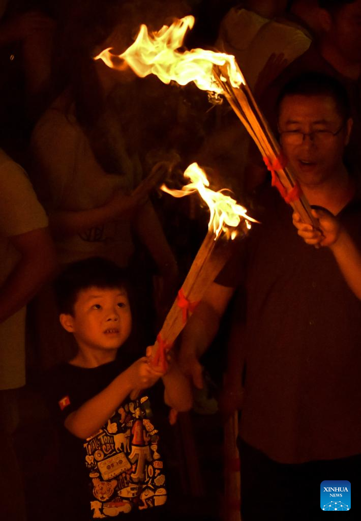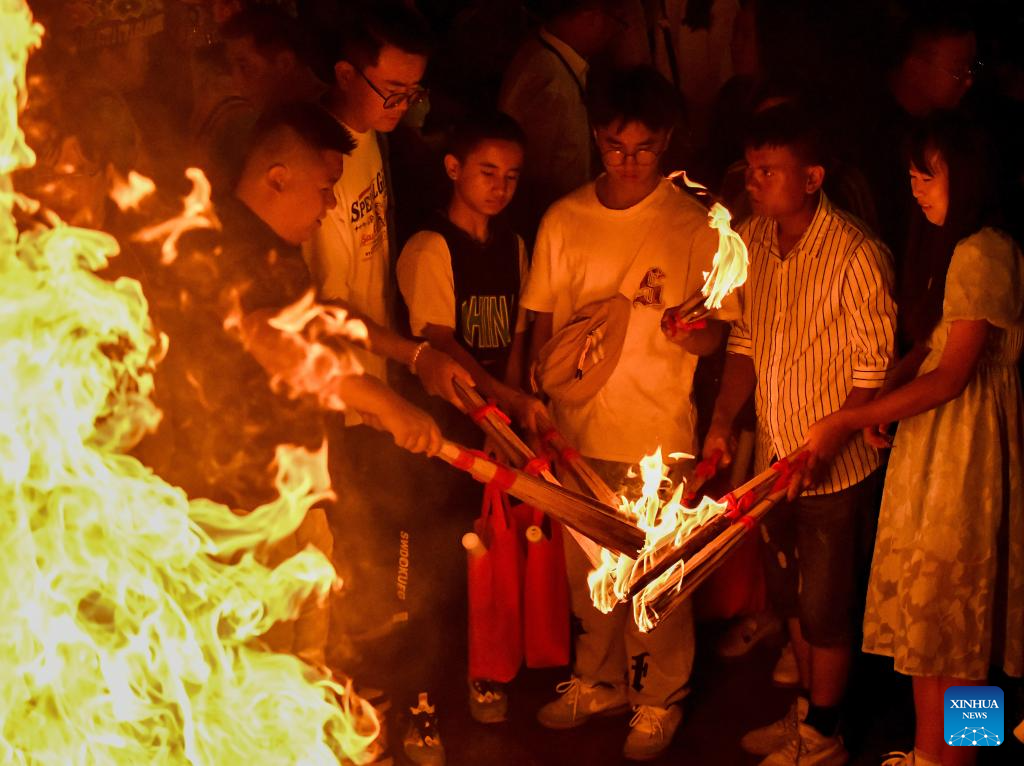 People light torches at a torch festival in Chuxiong, southwest China's Yunnan Province, July 27, 2024.