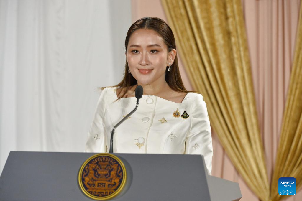 Thailand's new Prime Minister Paetongtarn Shinawatra (1st R) gives a speech after receiving the royal endorsement for the post at the headquarters of the Pheu Thai party in Bangkok, Thailand, Aug. 18, 2024. Thailand's King Maha Vajiralongkorn has appointed Paetongtarn Shinawatra as the country's prime minister, Secretary-General of the House of Representatives Arpath Sukhanunth announced on Sunday. (Thai Government House/Handout via Xinhua)