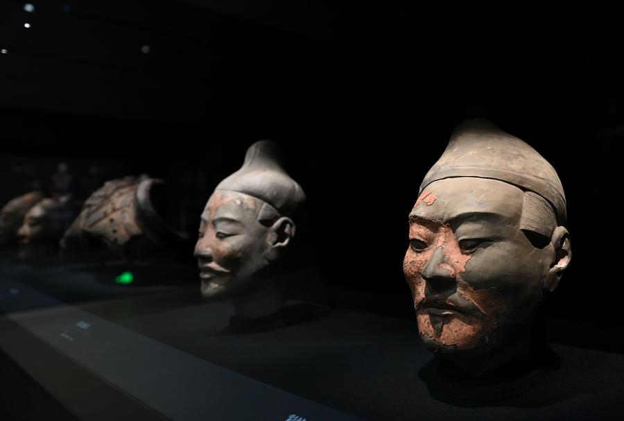 Color-painted figure heads are pictured during an exhibition commemorating the 50th anniversary of the discovery and excavation of the iconic Terracotta Warriors at the Emperor Qinshihuang's Mausoleum Site Museum in Xi'an, capital of northwest China's Shaanxi Province, Sept. 8, 2024. (Xinhua/Li Yibo)