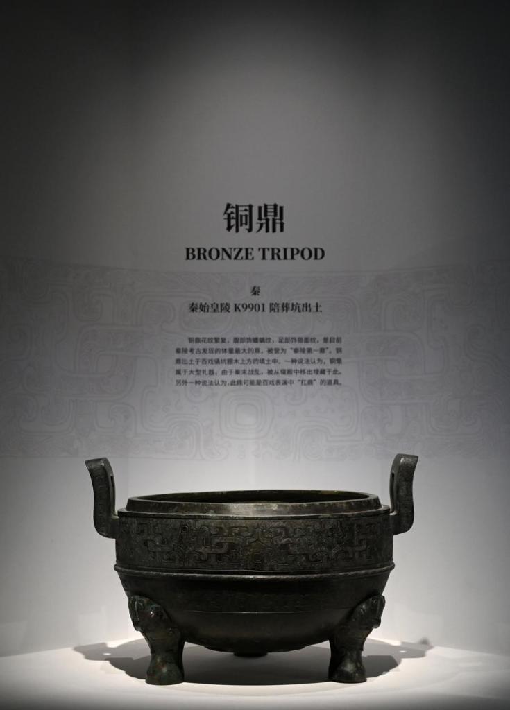 A bronze tripod is pictured during an exhibition commemorating the 50th anniversary of the discovery and excavation of the iconic Terracotta Warriors at the Emperor Qinshihuang's Mausoleum Site Museum in Xi'an, capital of northwest China's Shaanxi Province, Sept. 8, 2024. (Xinhua/Li Yibo)