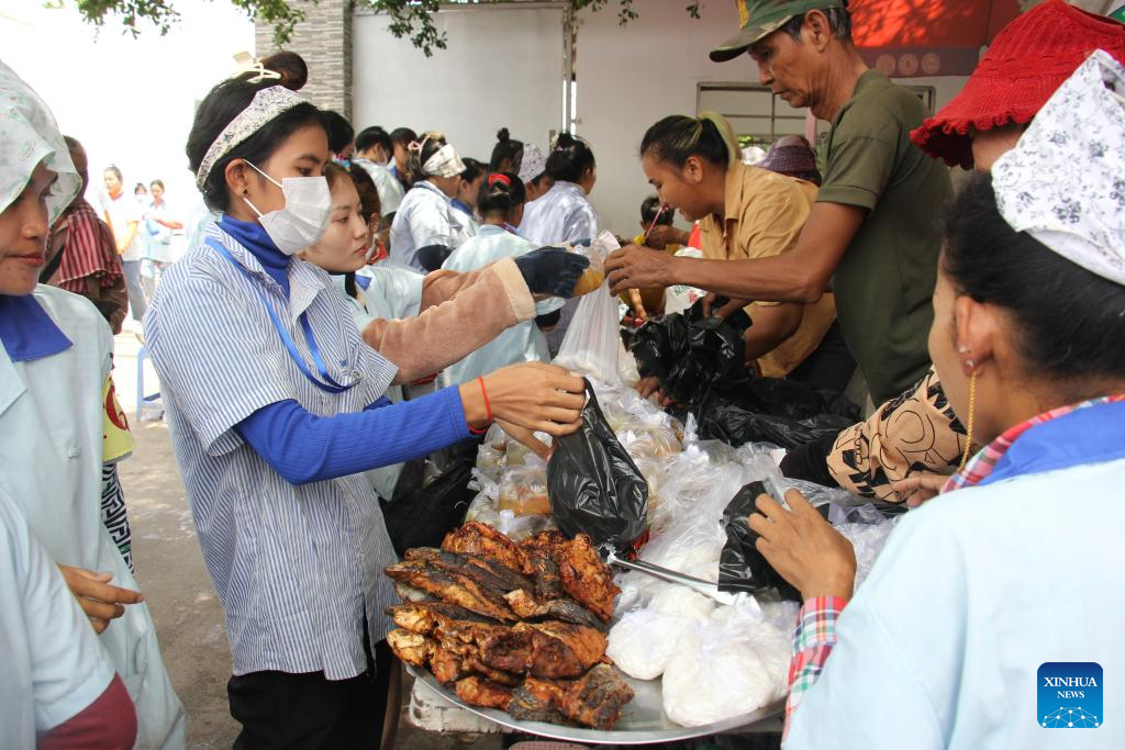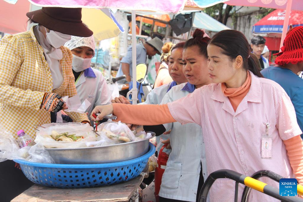 Garment factory workers buy food in Phnom Penh, Cambodia on Sept. 19, 2024. Cambodia on Thursday set a new monthly minimum wage for the country's garment, footwear and travel goods industry at 208 U.S. dollars for 2025, up 1.96 percent from the current 204 dollars, Labor and Vocational Training Minister Heng Sour said. (Photo by Phearum/Xinhua)