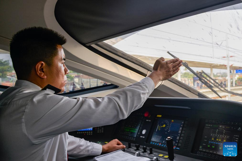 Zhang Yue operates at the cab of a high-speed train in Bandung, Indonesia, Sept. 12, 2024. (Xinhua/Xu Qin)