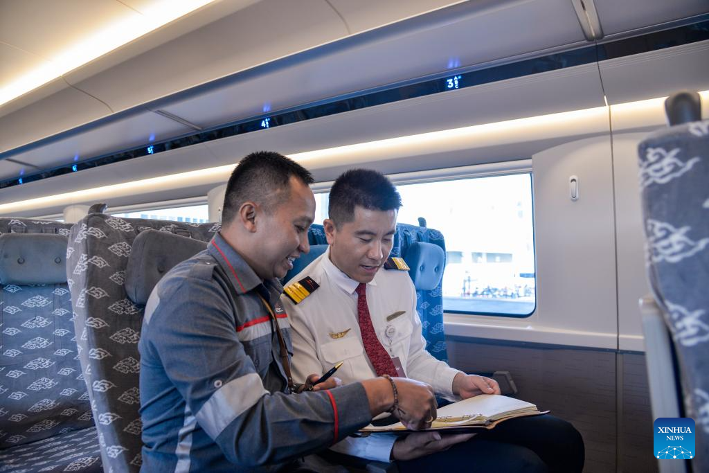 Zhang Yue (R) communicates with Indonesian train driver Agus Dwiono Widodo on a high-speed train in Bandung, Indonesia, Sept. 12, 2024. (Xinhua/Xu Qin)