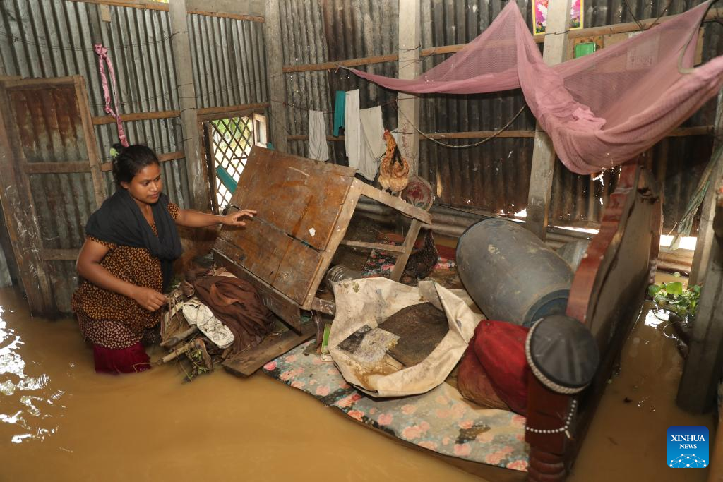 This photo shows an interior view of a flooded house in Mymensingh, Bangladesh, Oct. 7, 2024. Days of devastating flash floods, triggered by heavy rains and upstream torrents, have stranded hundreds of thousands of people in Bangladesh's northern Mymensingh region, with thousands of homes still under water. (Xinhua)