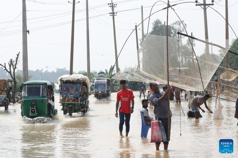 People wade through floodwater in Mymensingh, Bangladesh, Oct. 7, 2024. Days of devastating flash floods, triggered by heavy rains and upstream torrents, have stranded hundreds of thousands of people in Bangladesh's northern Mymensingh region, with thousands of homes still under water. (Xinhua)