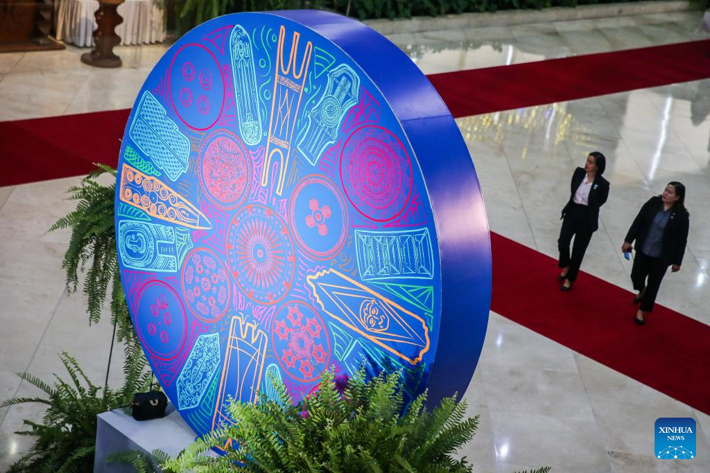 People walk past the logo of the Asia-Pacific Ministerial Conference on Disaster Risk Reduction in Pasay City, the Philippines on Oct. 15, 2024. (Xinhua/Rouelle Umali)