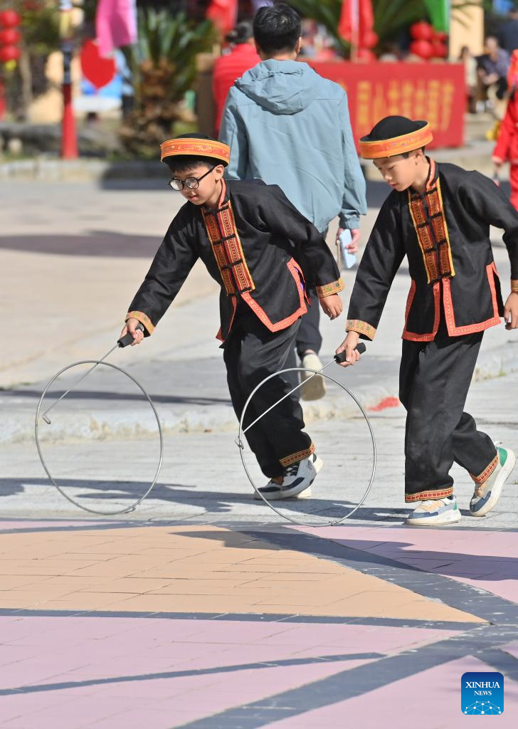 Teenagers of Yao ethnic group play iron-hoop rolling at a square in Changping Yao Township in Mengshan County, Wuzhou City, south China's Guangxi Zhuang Autonomous Region, Oct. 23, 2024. Various cultural activities have boosted the unity and common development of all ethnic groups in Mengshan. (Xinhua/Huang Xiaobang)