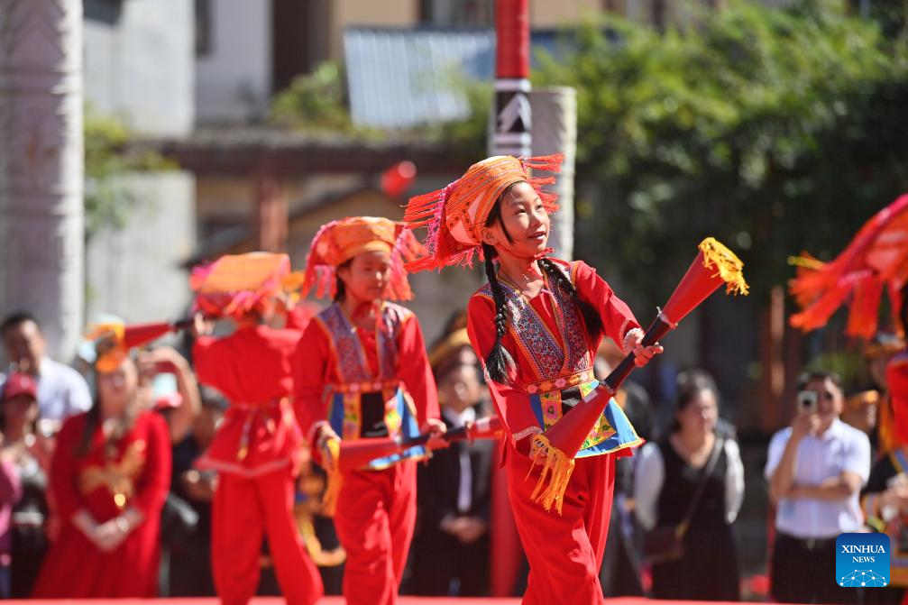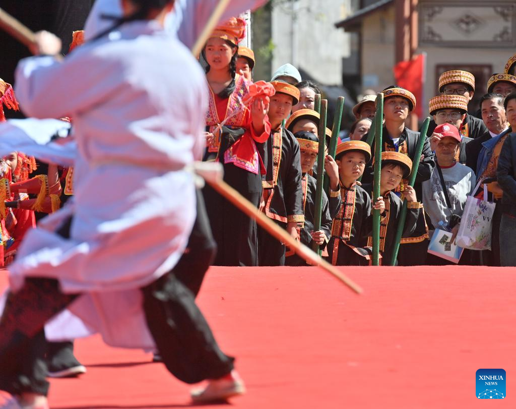 Actors perform a traditional Yao wedding ceremony in Changping Yao Township in Mengshan County, Wuzhou City, south China's Guangxi Zhuang Autonomous Region, Oct. 23, 2024. Various cultural activities have boosted the unity and common development of all ethnic groups in Mengshan. (Xinhua/Huang Xiaobang)