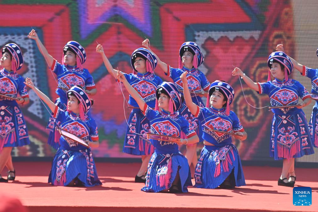 Actresses perform to demonstrate Yao embroidery skill at a square in Changping Yao Township in Mengshan County, Wuzhou City, south China's Guangxi Zhuang Autonomous Region, Oct. 23, 2024. Various cultural activities have boosted the unity and common development of all ethnic groups in Mengshan. (Xinhua/Huang Xiaobang)