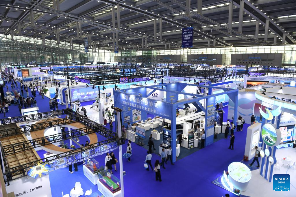 This photo taken on Oct. 31, 2024 shows the venue for the 2024 China Marine Economy Expo (CMEE) in Shenzhen, south China's Guangdong Province. The 2024 CMEE kicked off in Shenzhen on Thursday, comprehensively showcasing China's marine economic development, and scientific and technological innovation. (Xinhua/Liang Xu)
