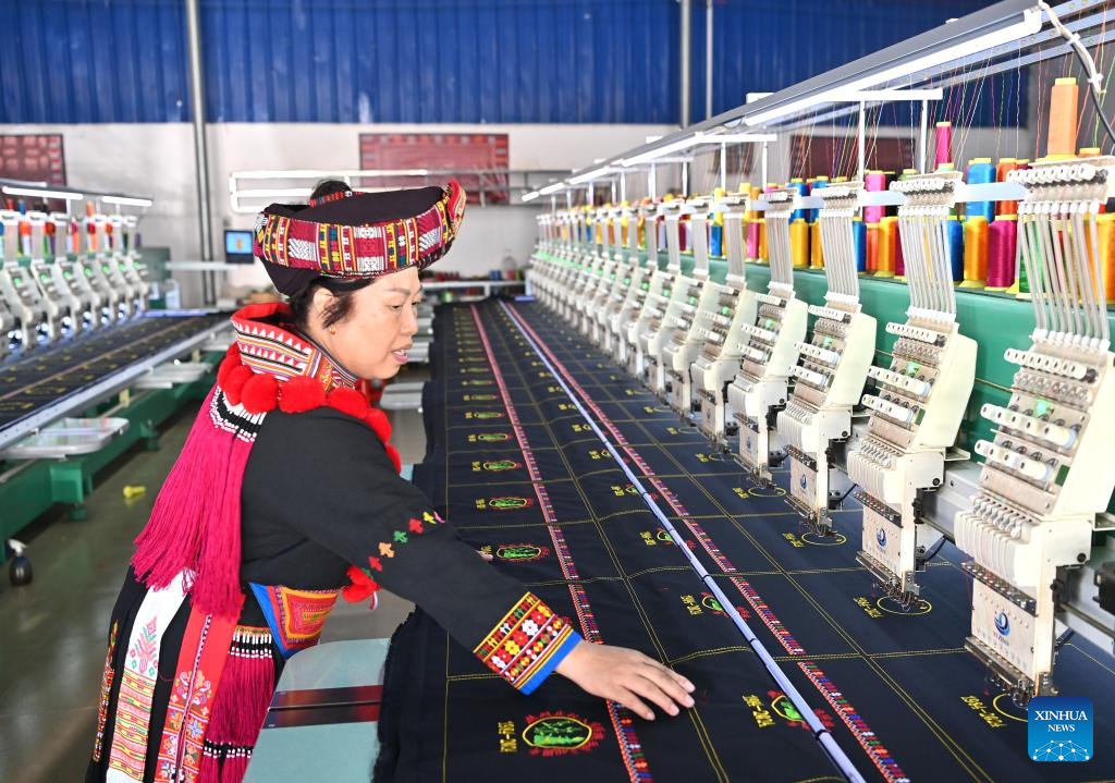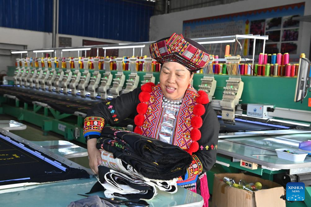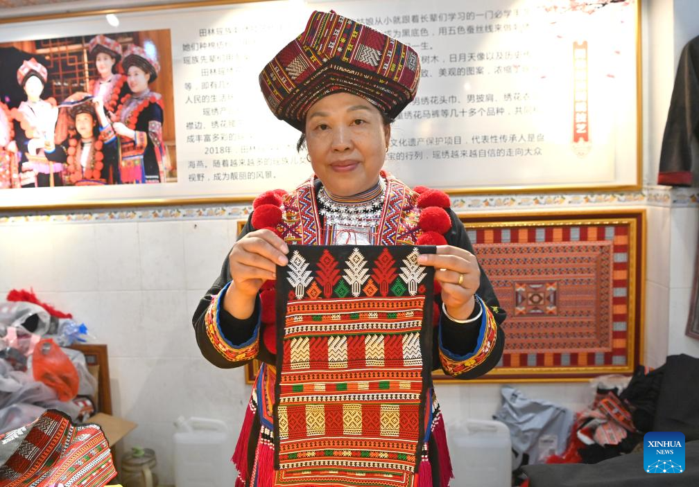 Pan Haiyan carries cloth in her embroidery workshop in Tianlin County, Baise City, south China's Guangxi Zhuang Autonomous Region, Oct. 31, 2024. Boasts a long history, Tianlin Yao ethnic embroidery skill is known for exquisite patterns, with the themes of creation mainly based on life of the Yao people.