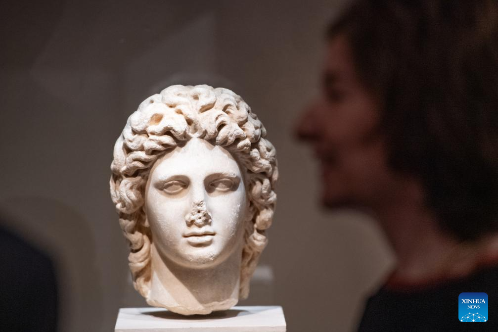 This photo taken on Nov. 20, 2024 shows a head sculpture of Alexander the Great at the exhibition "The Greeks: Agamemnon to Alexander the Great" at Capital Museum in Beijing, capital of China. Featuring a total of 270 pieces or sets of exhibits from 14 museums across Greece, the exhibition will open to public on Nov. 21, 2024 and last till May 18, 2025. (Xinhua/Chen Zhonghao)