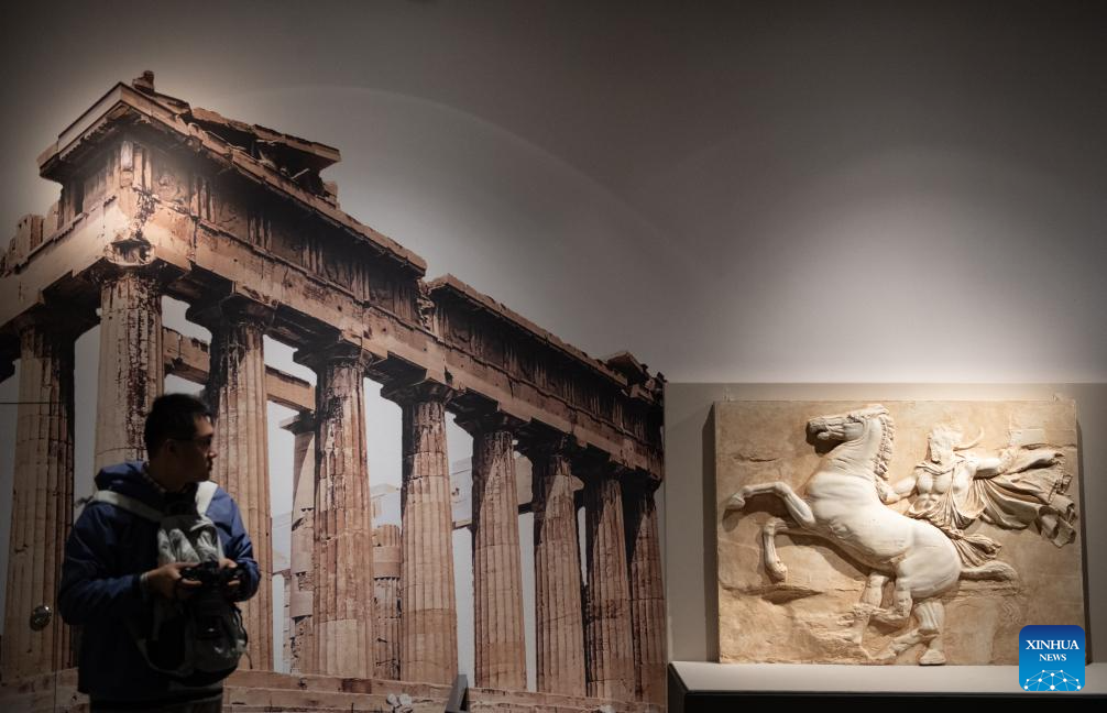 A visitor views a piece of relief from the Parthenon on display at the exhibition "The Greeks: Agamemnon to Alexander the Great" at Capital Museum in Beijing, capital of China, Nov. 20, 2024. Featuring a total of 270 pieces or sets of exhibits from 14 museums across Greece, the exhibition will open to public on Nov. 21, 2024 and last till May 18, 2025. (Xinhua/Chen Zhonghao)