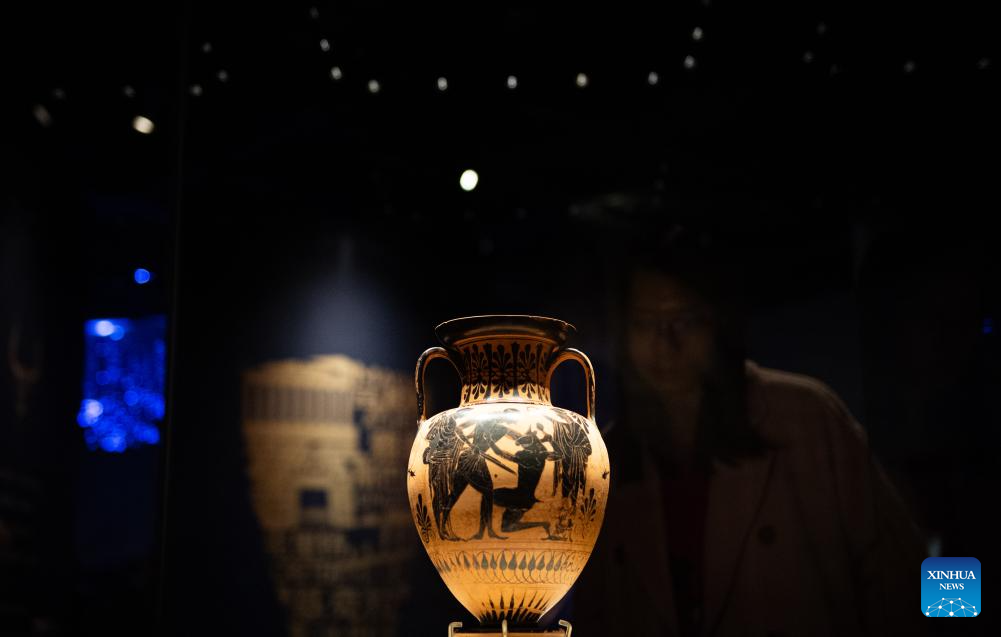This photo taken on Nov. 20, 2024 shows a painted amphora on display at the exhibition "The Greeks: Agamemnon to Alexander the Great" at Capital Museum in Beijing, capital of China. Featuring a total of 270 pieces or sets of exhibits from 14 museums across Greece, the exhibition will open to public on Nov. 21, 2024 and last till May 18, 2025. (Xinhua/Chen Zhonghao)
