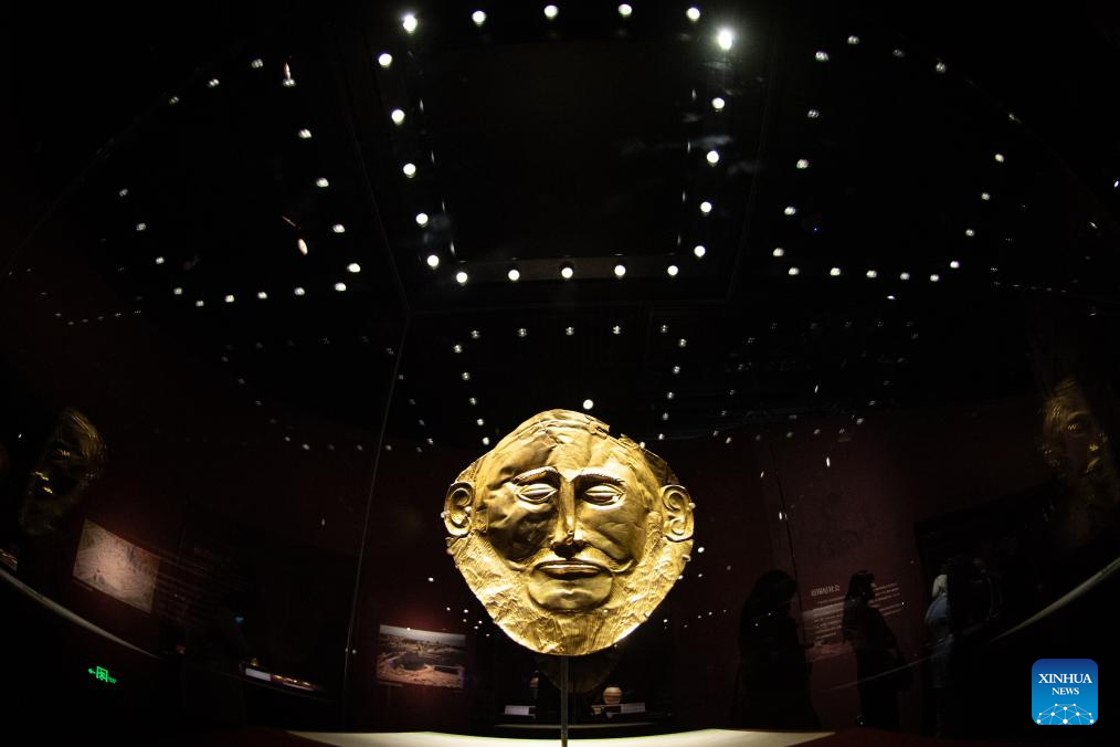This photo taken on Nov. 20, 2024 shows a replica of the "Agamemnon gold mask" on display at the exhibition "The Greeks: Agamemnon to Alexander the Great" at Capital Museum in Beijing, capital of China. Featuring a total of 270 pieces or sets of exhibits from 14 museums across Greece, the exhibition will open to public on Nov. 21, 2024 and last till May 18, 2025. (Xinhua/Chen Zhonghao)