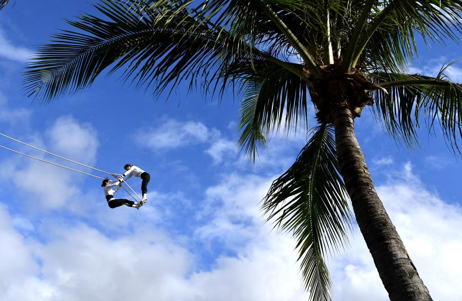 Athletes compete during the swing competition at the 12th National Traditional Games of Ethnic Minorities of China in Sanya, south China's Hainan Province, Nov. 24, 2024. (Xinhua/Wang Xiao)
