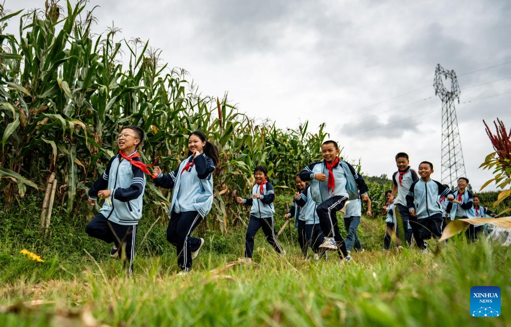 Students of the Mangshui Town Central School have fun in a grain field in Mangshui Town of Changning County, Baoshan City, southwest China's Yunnan Province, Sept. 12, 2024. (Xinhua/Jiang Wenyao)