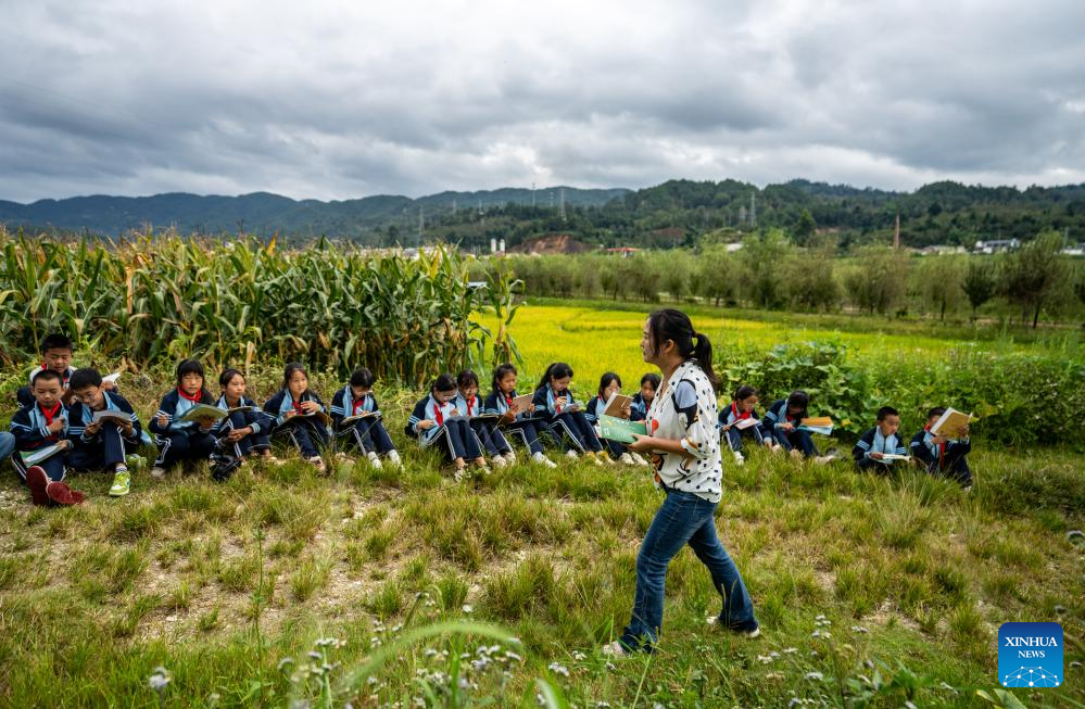 Students of the Mangshui Town Central School walk into a grain field to take their poetry class in Mangshui Town of Changning County, Baoshan City, southwest China's Yunnan Province, Sept. 12, 2024. (Xinhua/Jiang Wenyao)