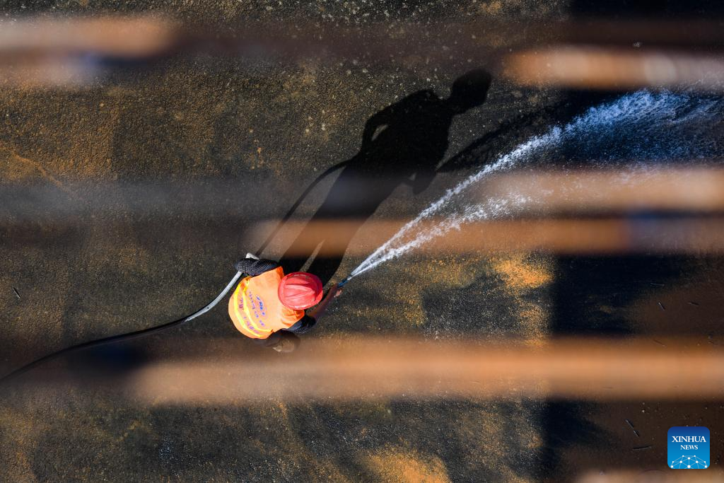 An aerial drone photo shows a worker working at the construction site of an expressway in Yiliang County of Kunming, southwest China's Yunnan Province, Dec. 2, 2024. Multiple transportation infrastructure projects are currently under construction in Yunnan, which are expected to greatly improve the transportation system in the province. (Photo by Peng Yikai/Xinhua)
