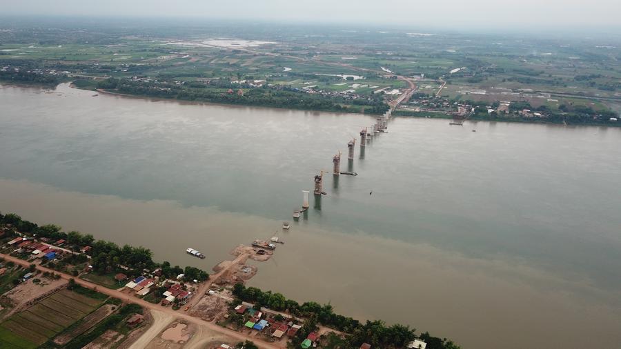 An aerial drone photo taken on May 23, 2024 shows the construction site of the Mekong River bridge in Kratie province, Cambodia. (Photo by Van Pov/Xinhua)