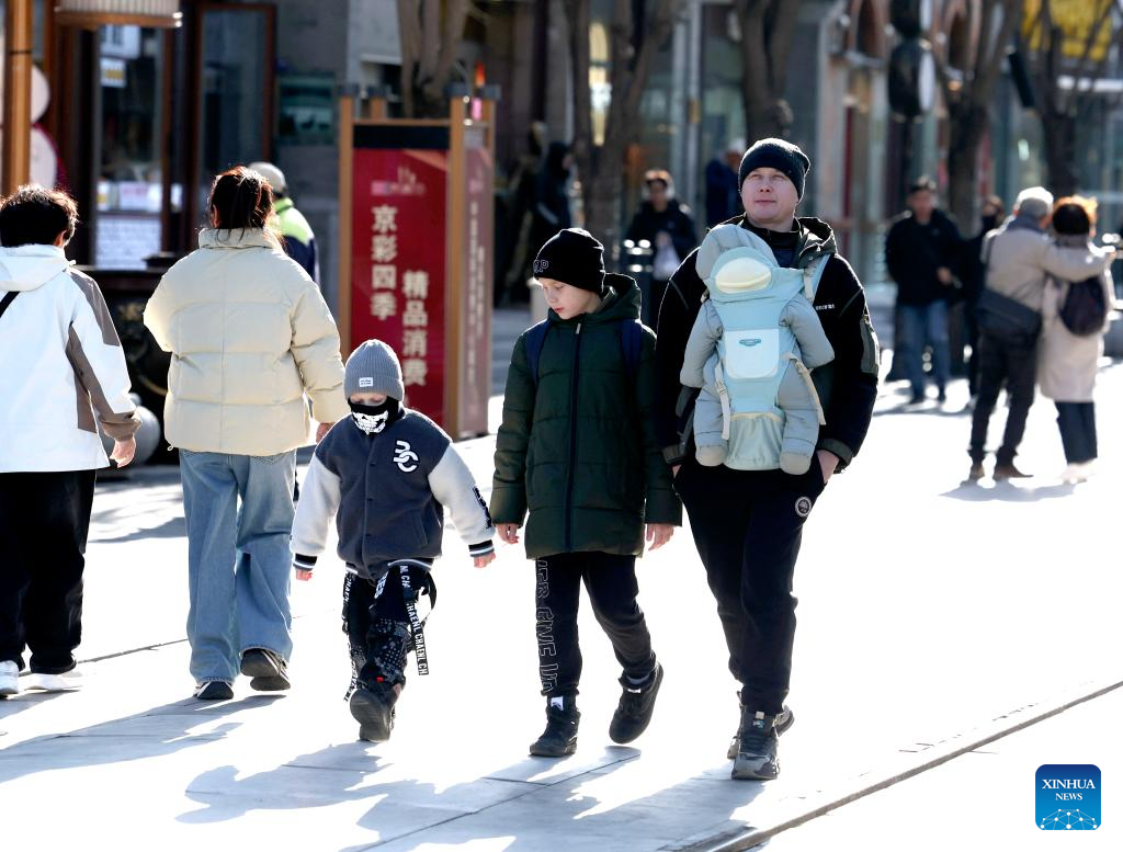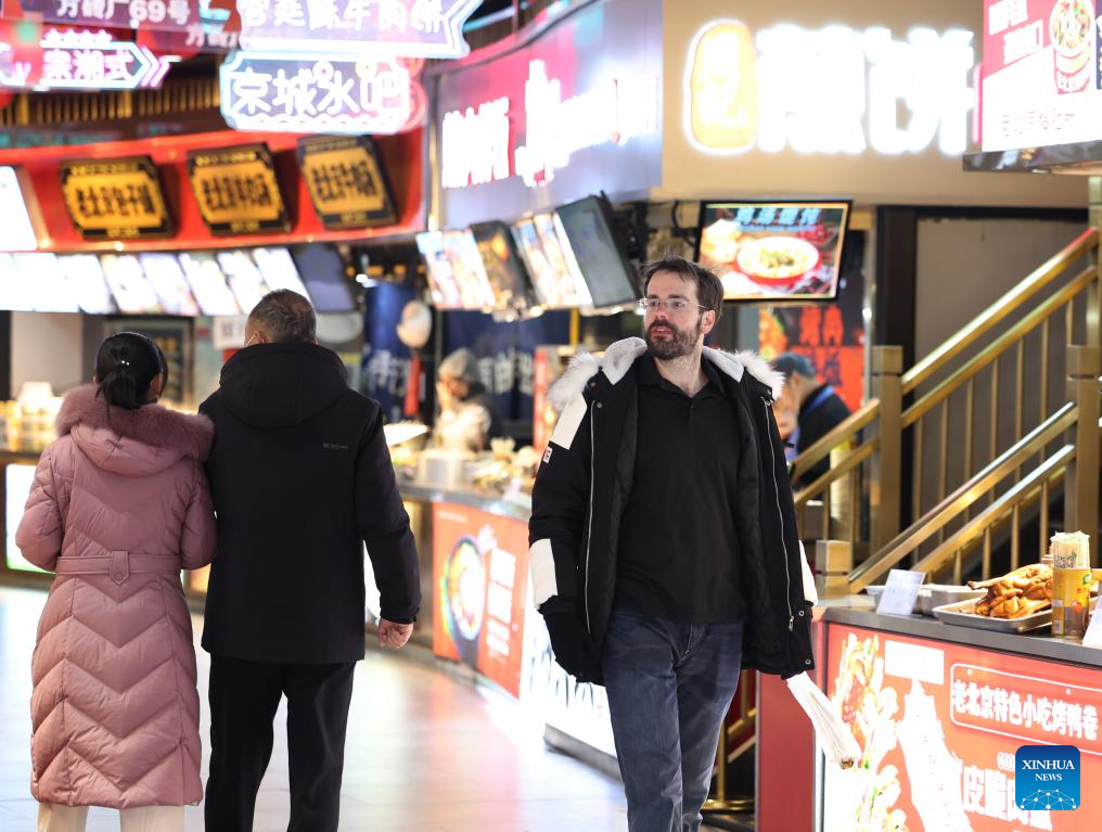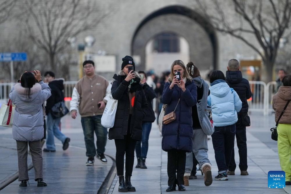 Foreign tourists visit Qianmen street in Beijing, capital of China, Dec. 5, 2024. Expanding visa-free policy is a milestone in China's journey toward greater openness and also shows its confidence on the global stage. So far, 38 countries enjoy unilateral visa-free access, and the maximum stay for visitors has been extended to 30 days as of Nov. 30.