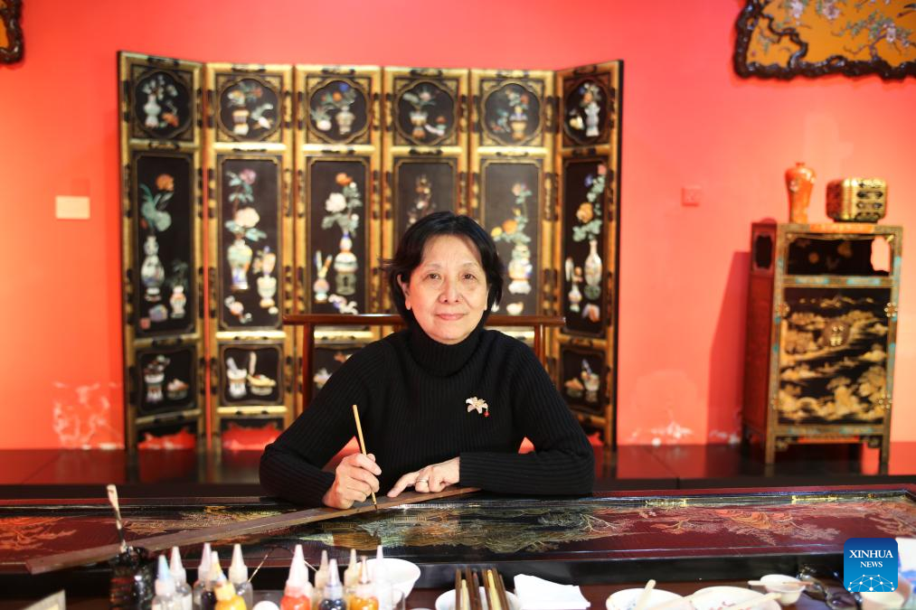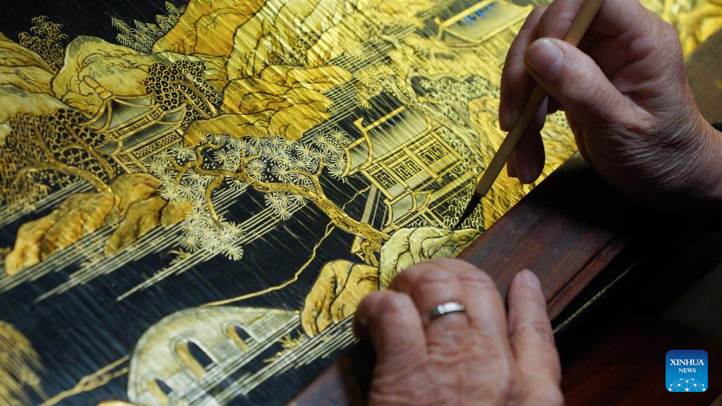 Hu Xin paints colors on a Gold Lacquer Inlay artwork at the Beijing Gold Lacquer Inlay Art Museum in Beijing, capital of China, Dec. 10, 2024. (Xinhua/Li Xin)